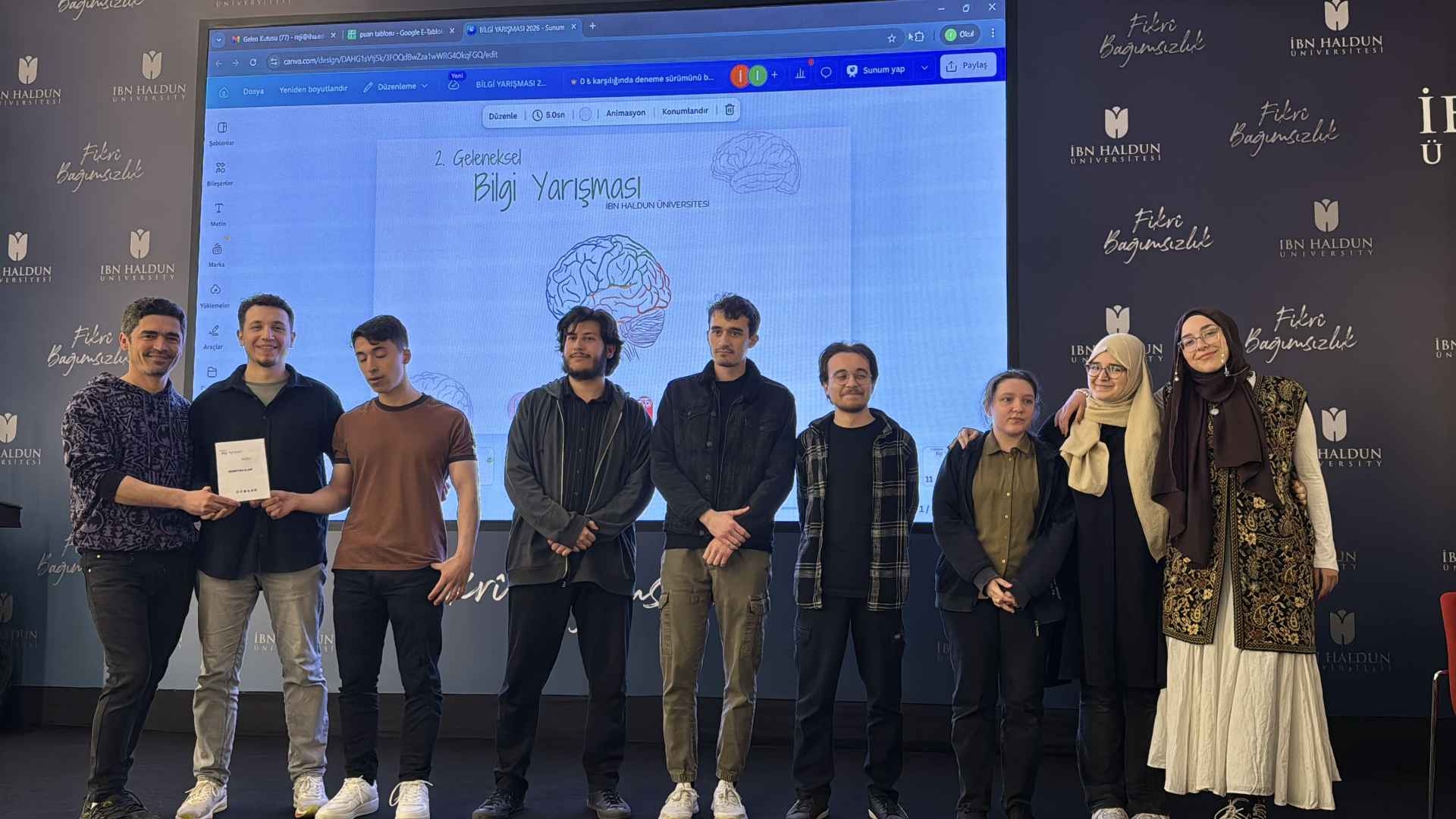 İbn Haldun Üniversitesi kulüpleri tarafından düzenlenen 2. Geleneksel Bilgi Yarışması kapsamında, 16 Nisan 2026 tarihinde Medya Merkezi Etkinlik Salonu’nda öğrencilerle bir araya gelindi. Genel kültür bilgisini ölçmeye yönelik hazırlanan bu heyecan dolu yarışmada, üçer kişilik takımlar aynı anda yarışarak toplam 20 sorudan oluşan etapta bilgi ve hızlarını ortaya koydu. Farklı puanlandırma kriterleriyle değerlendirilen sorular, katılımcılara hem rekabetçi hem de keyifli bir ortam sundu. Etkinlik sonunda dereceye giren takımlar ödüllerini alırken, tüm katılımcılar bilgi dolu ve eğlenceli bir deneyim yaşama fırsatı elde etti.