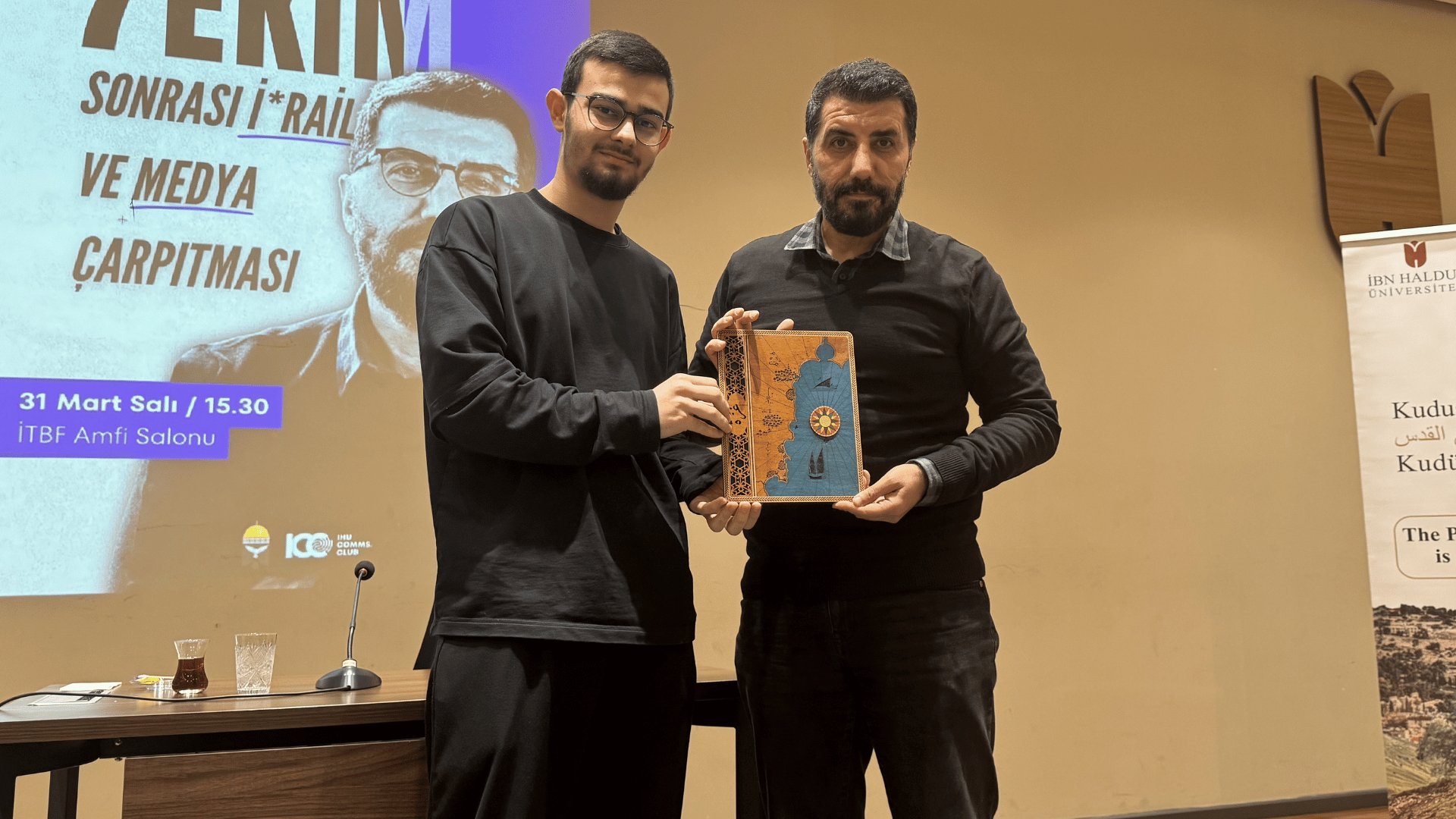 Kudüs Topluluğu ve İletişim Kulübü ortaklığında düzenlenen "7 Ekim Sonrası İsrail ve Medya Çarpıtması" başlıklı konferans, 31 Mart 2026 tarihinde gerçekleştirildi. Programda, olayların medya üzerinden nasıl manipüle edildiği ve algı operasyonlarına karşı nasıl bir iletişim stratejisi izlenmesi gerektiği uzman görüşleriyle tartışıldı. Her iki kulübümüz de toplumsal farkındalık oluşturma misyonuyla çalışmalarını sürdürüyor.